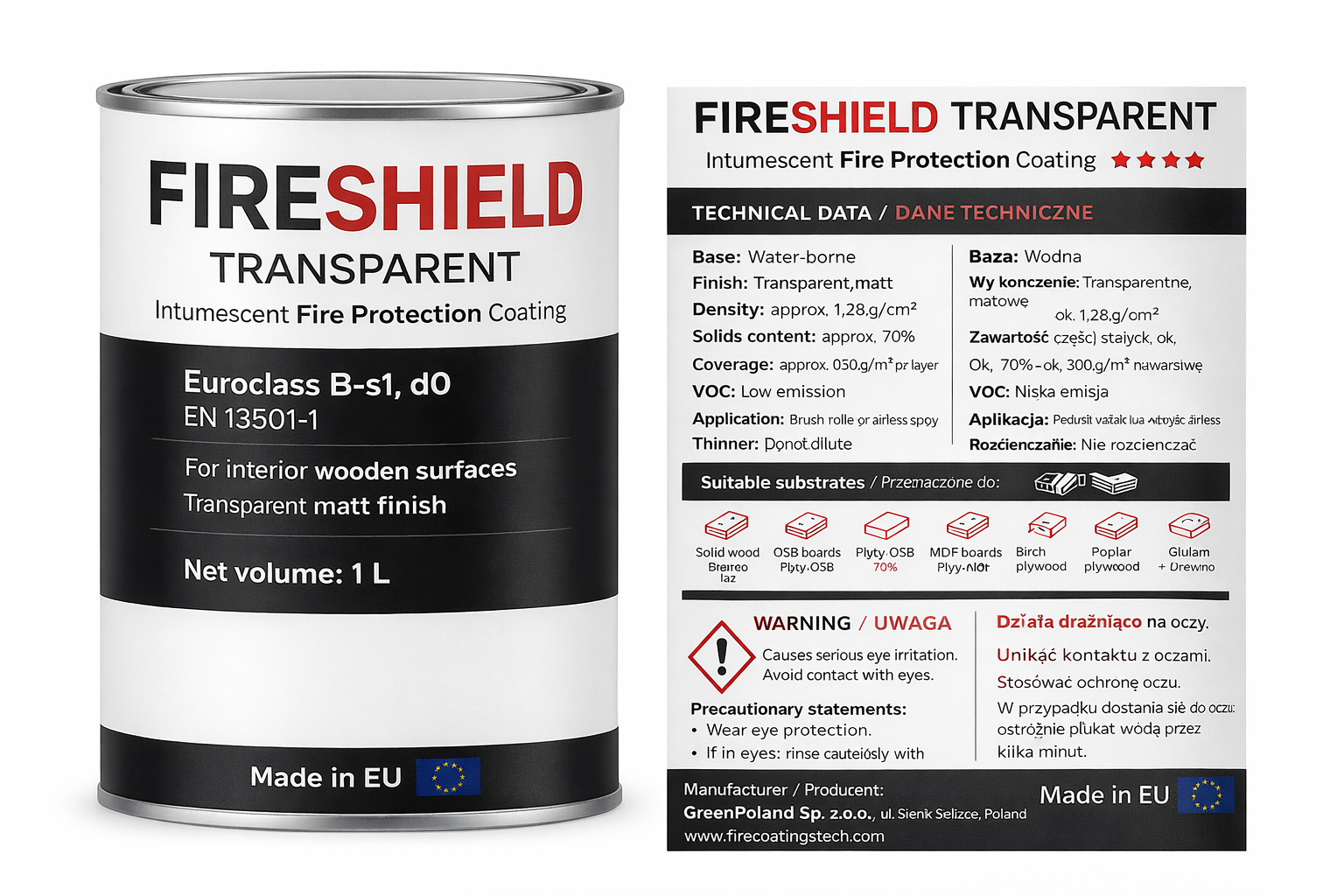 FireShield Transparent Economic to zaawansowana, przejrzysta powłoka intumescencyjna, która przekształca zwykłe drewno i materiały drewnopochodne w produkty o ograniczonej palności klasy B-s1,d0.