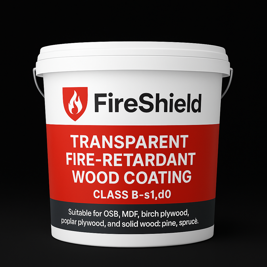 Transparent fire retardant coating for solid wood and engineered wood materials. FireShield Transparent Economic provides certified fire reaction classification B-s1,d0 according to EN 13501-1. Ideal for furniture, MDF, OSB, birch plywood, pine, spruce, beech, and similar substrates. Available in 1 L, 5 L, 20 L, and 1000 L packaging.